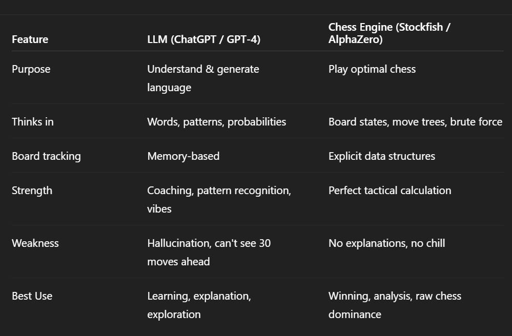 After the match, I asked ChatGPT to put together a table on how engines trained specifically to play chess operate, versus LLMs that have mostly learned to predict the next move from reading match summaries and the like: